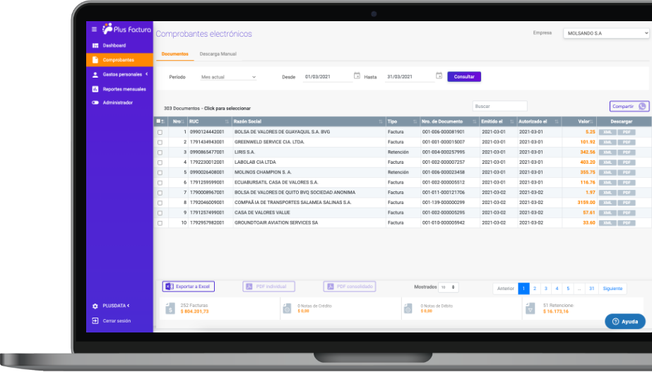 Con Plusfactura descarga y gestiona tus documentos electrónicos de forma automática y en un solo lugar. Mejorando tu experiencia y agilitando los procesos en tu empresa o negocio.